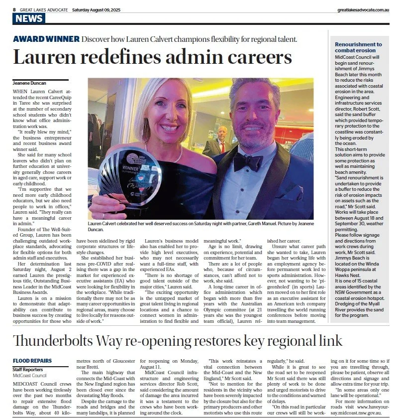 Lauren was recently featured in The Great Lakes Advocate (9 August 2025) after being named Outstanding Business Leader of the Year at the Mid Coast Business Awards - recognising her bold leadership and unwavering commitment to championing flexible career pathways for both administrative professionals and executives.
